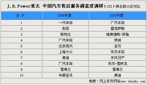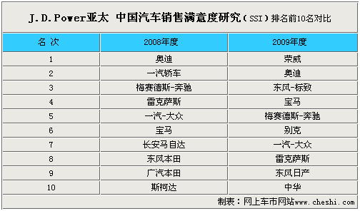 通過(guò)以上08年度與09年度的J.D. Power(亞太公司)中國(guó)汽車(chē)銷(xiāo)售滿意度前10名的對(duì)比我們不難看出,合資品牌還是占據(jù)了主要的位置,但日系廠商的排名有所下降。08年度的第一名奧迪意外的被自主品牌榮威所代替,寶馬提升至第4名,梅賽德斯-奔馳落后2名。而中華則闖入前10名,替代了斯柯達(dá)的位置。