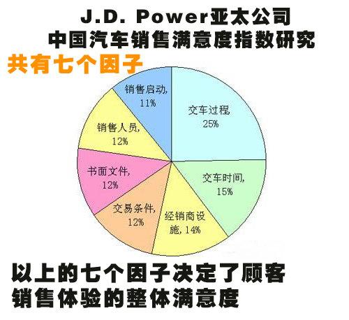 J.D. Power亞太公司在中國(guó)開(kāi)展的汽車(chē)銷(xiāo)售滿意度指數(shù)研究共有七個(gè)因子決定了顧客銷(xiāo)售體驗(yàn)的整體滿意度;根據(jù)重要性排列,分別是:交車(chē)過(guò)程、交車(chē)時(shí)間、經(jīng)銷(xiāo)商設(shè)施、銷(xiāo)售人員、書(shū)面文件、交易條件和銷(xiāo)售啟動(dòng)。
