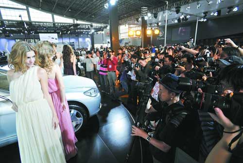 網(wǎng)友“午夜鐘聲”正在奔馳展位上尋找著最合適的拍攝位置,“去年奔馳展位上的洋車模最為出彩,今天肯定要來看一看。”他9點就來到車展主會場,帶著全套攝影裝備,一個小時收獲了300多張照片,“回去整理好就貼我的博客上去。”他興沖沖地說。