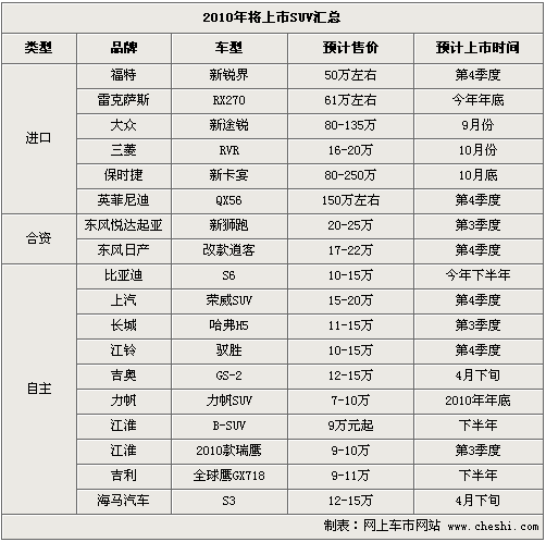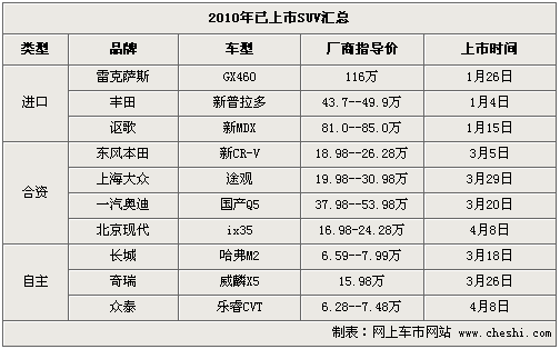 從年初至今,已經(jīng)上市的SUV車型達(dá)到了10款之多,而3月上市的就占到5款。其中上海大眾途觀在上市預(yù)售首月訂單就突破了4萬輛的;隨后上市的國產(chǎn)奧迪Q5訂單已經(jīng)排到明年,目前購買這兩款車仍需要加2.5萬-3萬元才能提到現(xiàn)車。而4月8日上市的iX35則又將在日系車市場掀起一股搶購熱潮。