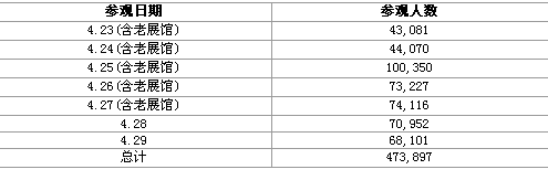 經(jīng)2010北京國(guó)際車展秘書處統(tǒng)計(jì),截止到2010年4月29日17:30,本屆北京國(guó)際車展新老展館參觀人員數(shù)量如下: