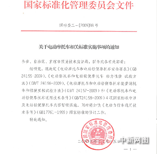 中新網(wǎng)12月16日電 今天,國家標(biāo)準(zhǔn)化管理委員會(huì)在其官方網(wǎng)站發(fā)出《關(guān)于電動(dòng)摩托車相關(guān)標(biāo)準(zhǔn)實(shí)施事項(xiàng)的通知》。通知要求,《電動(dòng)摩托車和電動(dòng)輕便摩托車通用技術(shù)條件》等4項(xiàng)國家標(biāo)準(zhǔn)中,涉及電動(dòng)輕便摩托車的內(nèi)容暫緩實(shí)施。