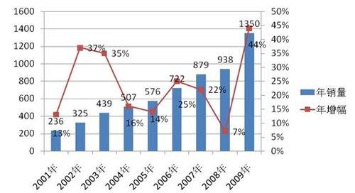 2001-2009年中國汽車銷量增長表 單位:萬輛(數(shù)據(jù)來源:中國汽車工業(yè)協(xié)會)