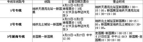 本次北京車展開通了兩條車展專用公交車線路和一條新-老國展展商專線。線路運營時間及票價如下: