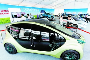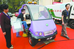 一踏上北京展覽館門前的小廣場,參觀者便立刻被露天擺放在廣場上的各種新能源汽車吸引住了?雌饋硭坪鹾推胀ɡ嚊]什么兩樣的桶裝垃圾運輸車與壓縮式垃圾車,實際上卻是靠電池來運行的;北汽的新能源汽車最高時速已經(jīng)可以達到每小時160公里;小型電動汽車“竹風(fēng)”只需要30分鐘即可快速充電80%……