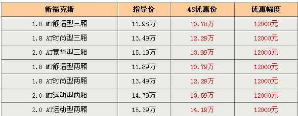 筆者日前走訪北京長安福特4S店時獲悉,目前新?怂箖(yōu)惠又提升2000元,全系優(yōu)惠1.2萬元,由于新嘉年華的上市,商家為了留出庫存故加大了新?怂沟淖尷。