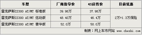 據(jù)4S店銷售人員介紹,目前雷克薩斯IS300各款現(xiàn)車數(shù)量并不多,標(biāo)準(zhǔn)版和炫動(dòng)版有銀色、白色、黑色等款可供選擇。在價(jià)格優(yōu)惠方面,現(xiàn)在購車可優(yōu)惠現(xiàn)金2萬,同時(shí)贈(zèng)送價(jià)值1.3萬元的保險(xiǎn)。銷售人員還介紹,購買IS300時(shí),根據(jù)車身顏色不同其價(jià)格還將有一定幅度的變化。