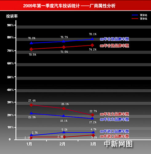 中新網(wǎng)4月24日電 日前,中國質(zhì)量協(xié)會用戶委員會、車人網(wǎng)聯(lián)合發(fā)布了2009年一季度中國汽車產(chǎn)品質(zhì)量與服務(wù)質(zhì)量分析報告。統(tǒng)計顯示,相比去年同期,合資品牌車型的投訴增加較快,進(jìn)口車投訴略有增加,自主品牌車型的投訴呈現(xiàn)遞減趨勢。