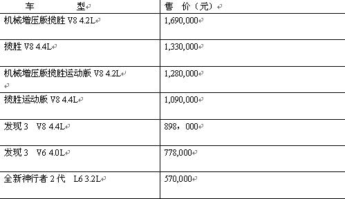 中新網(wǎng)11月8日電 近日,記者獲悉,路虎主力產(chǎn)品08款攬勝運(yùn)動(dòng)版正式登陸北京、華北、西北、西南市場(chǎng),其中4.4升V8汽油自然進(jìn)氣版價(jià)格為109萬元,4.2升V8機(jī)械增壓版價(jià)格為128萬元。經(jīng)銷商處現(xiàn)已接受預(yù)訂,訂金為5萬元。
