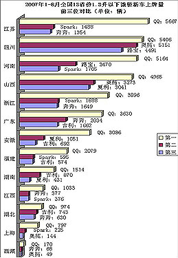 按07年1-8月份新車上牌量累計(jì),QQ系列轎車在安徽、福建、廣東、河南、湖北、湖南、江蘇、江西、山西、上海、四川、西藏、浙江13個(gè)省級(jí)行政區(qū)均榮膺微型轎車銷售第一,將夏利、奔奔、路寶、奧拓、Spark等微轎競品拋在后面。