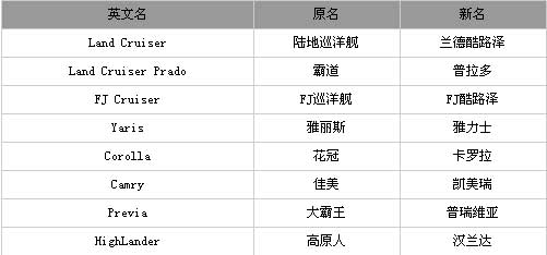 從最早的“霸道”因廣告事件更名“普拉多”(Prado),到“花冠”更名“卡羅拉”、“佳美”更名“凱美瑞”,以及最新的“蘭德酷路澤”和“FJ酷路澤”等。這也許是精明的日本人學(xué)習(xí)中國歷史并將之付諸實際的想法,他們希望在中國汽車市場能夠如秦始皇一般統(tǒng)一天下,并統(tǒng)一度量衡和文字。