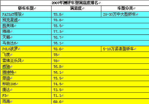中新網(wǎng)12月17日電 日前,中國質(zhì)量協(xié)會、全國用戶委員會公布了2007年度全國轎車用戶滿意度測評結(jié)果。結(jié)果顯示,2007年全國轎車用戶滿意指數(shù)(CACSI)為74.7分,比2006年提高1分。其中,上海大眾的PASSAT領(lǐng)馭和POLO分別以79.8分和78.8分的高分問鼎20-30萬中大型車和5-10萬緊湊型車兩類熱銷車型的滿意度冠軍寶座。