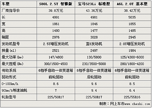 而在動(dòng)力配置方面,三款車分別為2.5T渦輪增壓、2.5L直六、2.0T增壓發(fā)動(dòng)機(jī),但從數(shù)據(jù)來(lái)看S80L的2.5T發(fā)動(dòng)機(jī)的優(yōu)勢(shì)比較明顯,但0-100km/h加速方面A6L更強(qiáng)僅為6.4S,而寶馬5系則要9.4S。而在驅(qū)動(dòng)形式方面,S80L和A6L都為前輪驅(qū)動(dòng),而寶馬5系則為后輪驅(qū)動(dòng)。