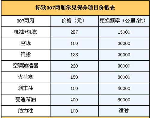 5.保養(yǎng)費: 我們向標致4S店售后服務人員咨詢過,他們說307一大優(yōu)勢是保養(yǎng)周期比較長,1.5萬公里才需要保養(yǎng)一次,是同級車型中保養(yǎng)花費最低的。通常新車首保在7500公里時進行,以后每1.5公里保養(yǎng)一次。第二次1.5萬公里時的常規(guī)保養(yǎng)(更換機油機濾)需花費287元;3萬公里保養(yǎng)(更換機油機濾+空濾+空調(diào)濾芯+汽濾+火花塞)為795元;4.5萬公里保養(yǎng)(更換機油機濾)花費287元;6萬公里保養(yǎng)(更換機油機濾+空濾+空調(diào)濾芯+汽濾+火花塞)為795元。