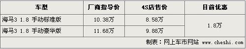 海馬系列車型一直有經(jīng)濟(jì)、省油等鮮明的特點(diǎn)。而在海馬3等一批車型上,則融合了更多時(shí)尚和運(yùn)動(dòng)的元素,同時(shí)全車在設(shè)計(jì)、配置以及燃油性上均有提升。根據(jù)網(wǎng)上車市價(jià)格監(jiān)測(cè)系統(tǒng)顯示,目前海馬3在售的兩款車型最高優(yōu)惠達(dá)到了1.8萬(wàn)元,具體車型以及價(jià)格如下: