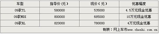 據謳歌經銷商表示,購買謳歌全系除了可以得到最高10萬元的價格優(yōu)惠外,09款TL僅售53.5萬元。銷售人員還表示,現(xiàn)在謳歌系列車型顏色和車型齊全,可以給客人與最大的選擇空間!