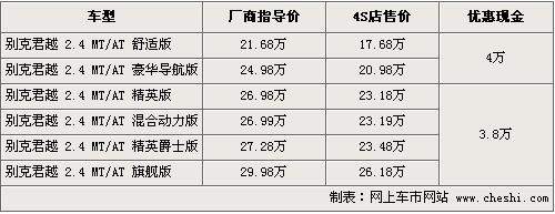 別克君越一直是中高級(jí)車市最受關(guān)注的車型之一,這款車搭載了全球普及率較高的ECOD-VVT2.4L全鋁智能發(fā)動(dòng)機(jī),并配以6速手自一體變速箱,在動(dòng)力上比老款有非常大的提升。根據(jù)網(wǎng)上車市價(jià)格監(jiān)測(cè)系統(tǒng)顯示,目前君越優(yōu)惠已過4萬(wàn)元,具體車型和價(jià)格如下: