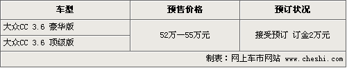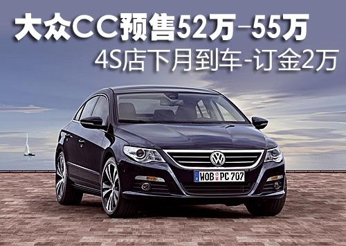 大眾CC自去年廣州車展亮相后一直受到消費者廣泛關(guān)注,此前有關(guān)這款車的詳細參數(shù)和配置已經(jīng)曝光。大眾CC將搭載3.6FSI燃油直噴引擎和6速DSG雙離合變速箱,將分豪華版和頂級版兩款。根據(jù)網(wǎng)上車市價格監(jiān)測系統(tǒng)顯示,目前這款車有望在下月到店,4S店開始接受消費者預(yù)訂,具體行情如下: