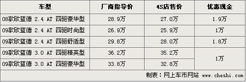 筆者從進口三菱北京地區(qū)經(jīng)銷商處了解到,目前歐藍德還有少量08款2.4排量車型,原來知道售價為28.9萬,現(xiàn)在可以優(yōu)惠1.9萬元。09款新車在售的車型主要是2.4四驅(qū)舒適型和3.0四驅(qū)豪華型兩款,其他兩款車均需要預(yù)訂。目前新款車優(yōu)惠最高也有1.8萬的降幅。目前4S店現(xiàn)車主要是金色、銀色、黑色、灰色等款。