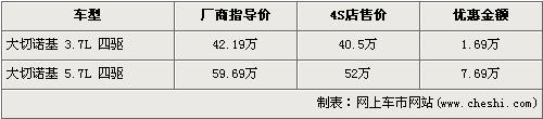 吉普大切諾基是吉普家族中極具個性的一款大尺寸車型,在推出3.7L排量車型后,消費者的選擇空間更大,同時帶給駕乘者完全不同的駕駛體驗。根據(jù)網上車市價格監(jiān)測系統(tǒng)顯示,目前大切諾基的售價最高可優(yōu)惠到7.69萬元,具體車型以及價格如下: