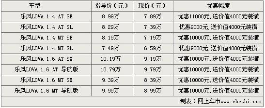 據(jù)雪佛蘭LOVA“樂風(fēng)”銷售人員表示,購買雪佛蘭LOVA“樂風(fēng)”車型除了可以得到10000元的價(jià)格優(yōu)惠外,還可以得到價(jià)值4000元的裝潢大禮包。優(yōu)惠后的雪佛蘭樂風(fēng)LOVA 1.4 SL MT僅售6.59萬元。