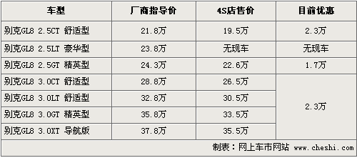 別克GL8是MPV市場一款非常受歡迎的車型,成為公司和商務(wù)用車的主要選擇對象,被稱為“陸上公務(wù)艙”。根據(jù)網(wǎng)上車市價(jià)格監(jiān)測系統(tǒng)顯示,目前這款車的優(yōu)惠幅度在原來2萬元基礎(chǔ)上增加到了2.3萬元,具體車型以及價(jià)格如下: