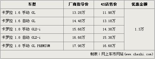 卡羅拉是一汽豐田07年推出的主力經(jīng)濟(jì)型轎車,此車全系共有5款車型,排量分為1.6L、1.8L,價(jià)格區(qū)間為13.28萬元-17.98萬元。近日根據(jù)網(wǎng)上車市價(jià)格監(jiān)測系統(tǒng)顯示,卡羅拉全系優(yōu)惠1.3萬元,最低售價(jià)不足12萬元,具體詳情請看下表: