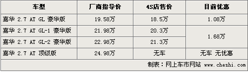 嘉華是起亞在國內(nèi)的首款MPV車型,相比奧德賽、GL8等同級(jí)車,嘉華在價(jià)格和油耗上有一定的優(yōu)勢,同時(shí)空間和配置也完全能夠滿足消費(fèi)者需求。根據(jù)網(wǎng)上車市價(jià)格監(jiān)測系統(tǒng)顯示,目前嘉華全系最高優(yōu)惠1.68萬元,具體行情如下: