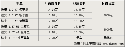 2月份,上海大眾進(jìn)行了09年首次價格調(diào)整,新途安的價格下調(diào)了3100元-3500元,售價為14.98萬-19.78萬。根據(jù)網(wǎng)上車市價格監(jiān)測系統(tǒng)顯示,在官方調(diào)整價格基礎(chǔ)后,近期4S店還有2000元-3000元的降幅,具體行情如下: