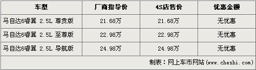 據(jù)北京一汽馬自達經銷店銷售人員介紹,馬自達6睿翼此次上市的車型分為售價21.68萬元的2.5L尊貴版,售價為22.98萬元的2.5L至尊版和售價為24.98萬元的2.5L導航版三款車型。目前店內可以接受馬自達6睿翼的購買訂單,訂金為2000元,并且可以無理由全額退還。消費者還介紹,目前店內已經到有至尊版展車供消費者品賞,第一批現(xiàn)車最早會在4月底到達經銷店。
