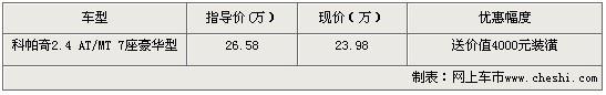 雪佛蘭Captiva科帕奇不僅豐富了雪佛蘭產(chǎn)品陣容,深化了雪佛蘭年輕活力、值得信賴的國(guó)際化品牌內(nèi)涵,更填補(bǔ)了上海通用汽車(chē)在中檔SUV細(xì)分市場(chǎng)上的空白。近日根據(jù)網(wǎng)上車(chē)市價(jià)格監(jiān)測(cè)系統(tǒng)顯示,上海地區(qū)購(gòu)買(mǎi)雪佛蘭科帕奇2.4 AT/MT 7座豪華型 可以得到2.6萬(wàn)元的價(jià)格優(yōu)惠。具體車(chē)型報(bào)價(jià)如下表: