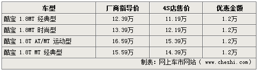 據(jù)4S店銷售人員介紹,此次酷寶系列車型涉及系列內各款車型,1.8L手動時尚型及1.8T自動版運動型車型的現(xiàn)車各店最高可給出12000元的現(xiàn)金優(yōu)惠。而1.8T系列車型部分顏色需要訂購,優(yōu)惠幅度同樣可達到1.2萬元;操控效果極佳的手動擋1.8L車型現(xiàn)車充足,享受優(yōu)惠的同時還可由經(jīng)銷商處添置價值近千元的車身裝飾,但不能折換現(xiàn)金。