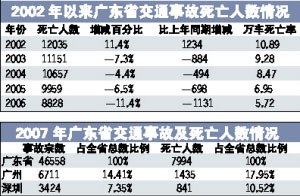 2007年,廣東省與廣州市地區(qū)均實(shí)現(xiàn)道路交通事故四項(xiàng)指數(shù)下降的目標(biāo)和特大交通事故大幅下降的目標(biāo),創(chuàng)造了道路交通事故死亡人數(shù)連續(xù)“五年連降”的成績(jī),2007年更是首次沒(méi)有發(fā)生一次死亡10人以上的惡性交通事故。