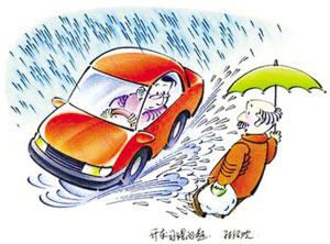 1月28日晚上7時許,記者在廣園路看到,由于連日陰雨不斷,雨勢加大,人行過道路面積了不少水,一些打著傘準備過馬路的行人小心翼翼地避讓著,但過往的不少出租車、小汽車拐彎經過時根本不減速,照樣疾馳而過,好幾個行人因避讓不及而“中招”,被飛濺起來的泥水弄濕了。