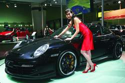 保時(shí)捷第一次以廠商名義參加廣州車展便給車迷帶來驚喜。911GT2——保時(shí)捷911系列性能之王的高性能跑車,采用后輪驅(qū)動(dòng)搭配6速手動(dòng)變速箱,100公里/每小時(shí)加速僅需3.7秒,最高時(shí)速為329公里。引人注目的前端大進(jìn)氣口和尾翼的設(shè)計(jì),是這款車型的典型特征。此外,配備獨(dú)家Porsche Design裝備的黑色限量版Cayman S硬頂跑車全球僅生產(chǎn)777輛,起售價(jià)為99.8萬人民幣!
