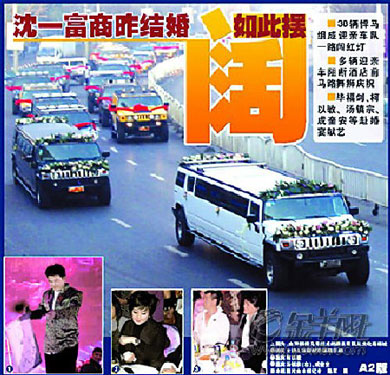片斷回放:11月24日上午7時(shí)許,沈陽市鐵西區(qū)沈遼中路西部汽配城路段,一個(gè)自西向東行駛的車隊(duì)迎面駛來,一輛豐田霸道越野車(錄像車)行駛在車隊(duì)前面,隨后是一白一黑兩輛加長悍馬越野車,再往后就是并排行駛的悍馬越野車和豐田霸道。這些車的前后車牌都貼上了“百年好合”字樣,擋住了車牌號(hào)。悍馬打著雙閃一路向東,甚至連紅燈都毫不理會(huì)一闖而過。這場婚禮由中央電視臺(tái)主持人畢福劍主持,包括柯以敏、成奎安、湯鎮(zhèn)宗等在內(nèi)的明星紛紛登臺(tái)獻(xiàn)藝。