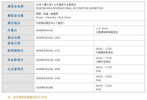 展覽時間:國內(nèi)外整車、商用車的展覽時間是 2008年4月22日至4月28日;國內(nèi)外零部件的展覽時間為2008年4月22日至4月25日。