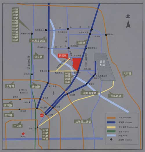 中國(guó)國(guó)際展覽中心新館位于北京順義天竺空港城商務(wù)區(qū),東鄰首都國(guó)際機(jī)場(chǎng),西靠溫榆河生態(tài)走廊,交通便利,風(fēng)景優(yōu)美。周邊有京密路、五環(huán)、六環(huán)、機(jī)場(chǎng)高速、京承高速、機(jī)場(chǎng)北線組成的高等級(jí)公路網(wǎng),公共交通包括輕軌、公交、出租及機(jī)場(chǎng)巴士。