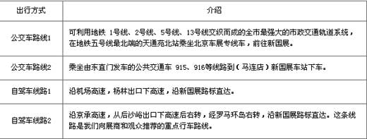 2.沿京承高速,從后沙峪出口下高速后右轉(zhuǎn),經(jīng)羅馬環(huán)島右轉(zhuǎn),沿新國展路標(biāo)直達(dá)。這條線路是我們向展商和觀眾推薦的重點行車路線。