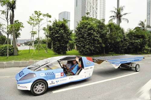 帕爾馬的太陽能車行駛中不產(chǎn)生任何尾氣和二氧化碳,所有動力均來自太陽能——其中50%來自瑞士Q-cells公司提供的裝載在車上的太陽能電池板,50%來自國際電網(wǎng)。而帕爾馬從國際電網(wǎng)獲得的電能和他瑞士家里屋頂太陽能電池板為國際電網(wǎng)充入的電能相當。陽光充足時,帕爾馬和他的太陽能的士每天可以行駛400公里。