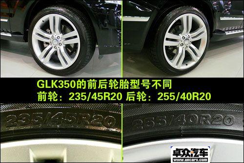 GLK大燈同樣采用簡單的直線條設(shè)計,只是邊角處加入了凌厲張揚的元素,看上去很像鷹眼,非?。這就是它“硬派”一面。而之所以說它“公路”,則是在它的總體定位——奔馳GLK是針對寶馬X3推出的緊湊型SUV車型,底盤懸掛系統(tǒng)以及動力配備都與X3類似。GLK350前后輪胎采用不同的尺寸,前輪采用較窄的235/45R20,后輪的則是稍寬的255/40R20,這樣的設(shè)計也是為了提升公路性能。