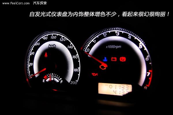 比較夢(mèng)幻的是絢麗的儀表。黑色的表底下白色泛出的刻度以及紅色的指針很是顯眼。面積雖然不大,但為整個(gè)內(nèi)飾都呈現(xiàn)出一種比較有檔次的效果。上面的擋板保證了其自發(fā)光的設(shè)定時(shí)刻都不會(huì)因?yàn)殛?yáng)光的原因而影響讀取信息,當(dāng)然如果面積更大一些的話,那感覺就會(huì)更好一些。