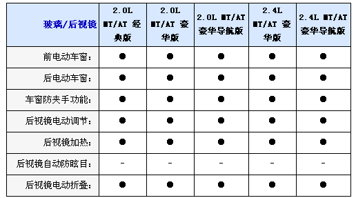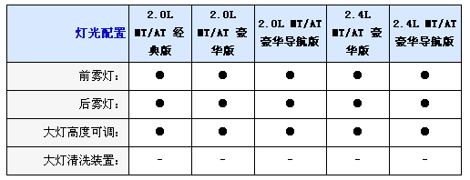此次推出的10款新車全部配備鹵素前大燈并且?guī)в写鬅羰謩痈叩驼{節(jié)功能,后尾燈標配LED燈組并且配備高位剎車燈,2.4L車型將會使用鍍鉻格柵和2.0L車型前臉將會有一定的區(qū)別,另外入門級車型即經典版車型不帶天窗;其它車型為標配,2.4L所有車型標配頂部行李架;但是2.0L車型則不會配備。