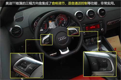 三輪輻運(yùn)動(dòng)方向盤包裹Nappa皮革,手感極佳。下部形狀扁平的設(shè)計(jì)與頂級(jí)超跑R8如出一轍。其實(shí)這種設(shè)計(jì)除了體現(xiàn)運(yùn)動(dòng)感外還有方便駕駛員進(jìn)出的實(shí)用功能。方向盤上還集成了音響控制、語音通話控制等多項(xiàng)功能,非常方便。