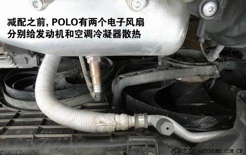 減配之前的POLO車前有一大一小兩個風(fēng)扇,一個是專門給發(fā)動機水箱降溫的大風(fēng)扇,一個是專門給空調(diào)冷凝器降溫的小風(fēng)扇。減配之后,只剩下一個大風(fēng)扇,能夠同時給兩處提供散熱。