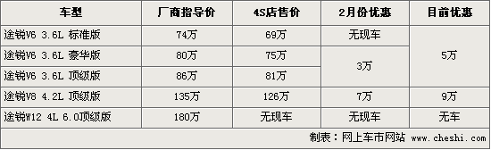 筆者從進口大眾經銷商處了解到,相比2月份途銳的優(yōu)惠幅度,目前優(yōu)惠有進一步加大,其中途銳V6三款車優(yōu)惠現(xiàn)金5萬元,而途銳4.2L頂級版則優(yōu)惠9萬元現(xiàn)金,比上月優(yōu)惠幅度均增加2萬元。但據(jù)4S店銷售人員介紹,目前3.6標準版和6.0頂級版尚沒有現(xiàn)車,其他各款有黑色和銀色可選擇,但數(shù)量非常少。在內飾顏色方面,途銳有米黃色、灰色、黑色和棕色四款可供選擇,而一般大眾顏色為米黃和灰色。近期,途銳將有部分新車到店,消費者可到4S店看車試駕。