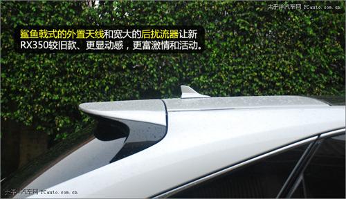 新RX350時(shí)髦地采用了多見(jiàn)于德系車的鯊魚(yú)戟式的天線,寬大的后擾流器作為標(biāo)配飾件出現(xiàn)在新車型上,讓整車在外觀上顯得動(dòng)感十足。