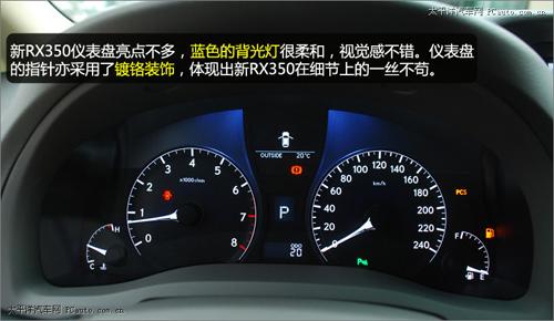 相對于充滿驚喜的方向盤,新RX350儀表盤的亮點并不多,藍瑟的背光燈很柔和,視覺感不錯。值得一提的是儀表盤的指針亦采用了鍍鉻裝飾,體現(xiàn)出新RX350在細節(jié)上的一絲不茍。