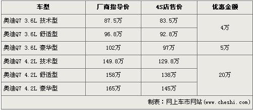 據(jù)經(jīng)銷商銷售人員介紹,奧迪Q7分為3.6L和4.2L兩種排量共7款車型,目前全系最高優(yōu)惠為20萬元現(xiàn)金。3.6L中的技術(shù)型和舒適型優(yōu)惠4萬元,優(yōu)惠后售價(jià)分別為:技術(shù)型83.5萬元,舒適型92.8萬元。3.6L豪華型經(jīng)5萬元優(yōu)惠后售價(jià)降到了97萬元。排量更大的4.2L車型優(yōu)惠更是達(dá)到了20萬元,優(yōu)惠后售價(jià)分別為技術(shù)型129.8萬元,舒適型138萬元,豪華型145萬元。