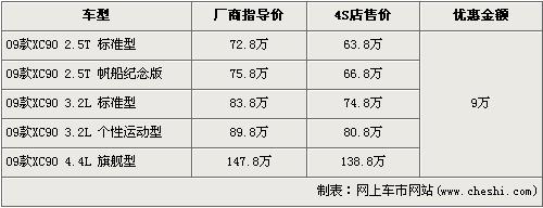 據(jù)沃爾沃經(jīng)銷商處銷售人員介紹,目前店內(nèi)的09款XC90車型全系都有9萬元的現(xiàn)金優(yōu)惠,并且此次優(yōu)惠活動截止到7月1日。經(jīng)優(yōu)惠后,2.5T標(biāo)準(zhǔn)型的售價跌破70萬元,僅售63.8萬元。2.5T 帆船紀(jì)念版經(jīng)9萬元優(yōu)惠后,售價從75.8萬元下降到了66.8萬元。兩款3.2L排量車型經(jīng)優(yōu)惠后售價降為74.8萬元及80.8萬元,頂配的4.4L旗艦車型售價降為了138.8萬元。銷售人員還介紹,XC90全系車型齊全,消費者挑選的空間較大。